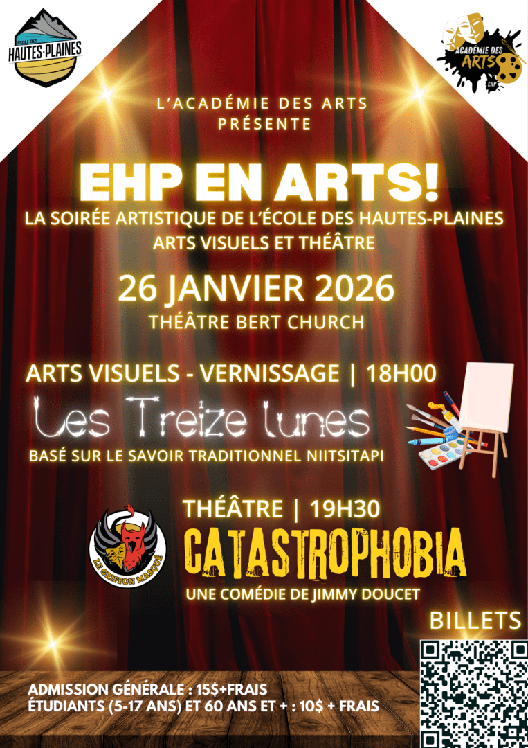 Il nous fait plaisir de vous lancer l’invitation à la soirée EHP en arts! organisé par l’Académie des arts de l’École des Hautes-Plaines, au théâtre Bert Church de la ville d’Airdrie, le lundi 26 janvier 2026, de 18h00 à 21h00.